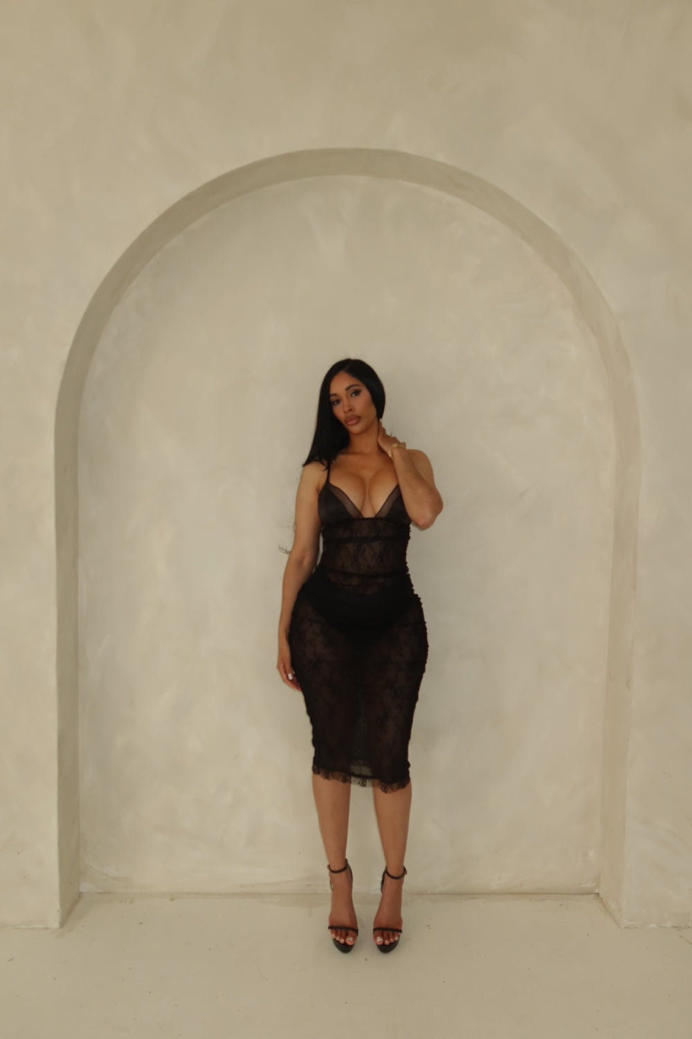 Lace midi slip dress with black undergarment included